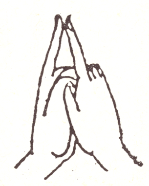手結二臂觀音菩薩手印,雙手作外金剛縛印,伸大指二指直併,誦念六字大明咒時,以手印印身五處,每一加持處,念誦六字大明咒一遍。